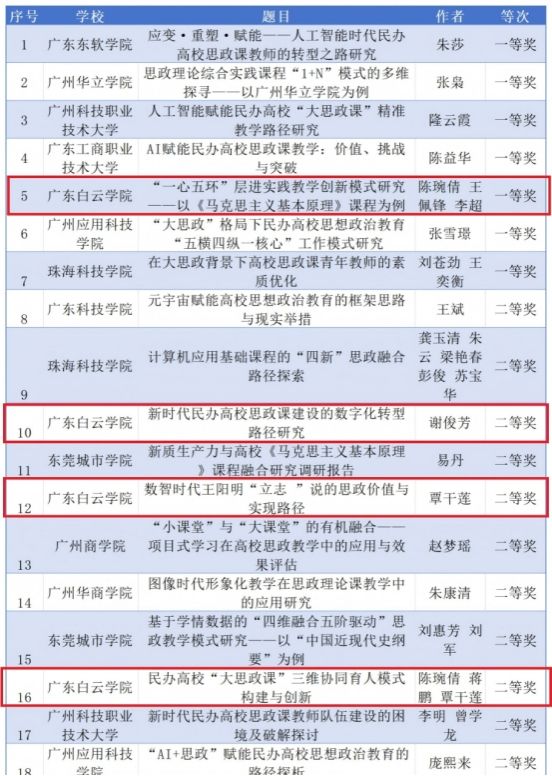 2025年6月19日,广东省高等学校思想政治教育研究会民办高校思想政治教育专业委员会正式公布 “2025 年广东省民办高校思想政治教育工作优秀成果评选” 活动获奖名单。我院教师凭借扎实的理论功底与创新的实践探索,在此次评选中表现亮眼,共有 14 项成果获奖,涵盖一、二、三等奖及优秀奖,其中陈琬倩、王佩锋、李超老师获得一等奖,谢俊芳、覃干莲、陈琬倩、蒋鹏老师获得二等奖,邢增銮副院长和桑立群副院长获得三等奖,付金辉教授、王梅副教授、马瑗、姬雅倩、杨霞、邹金武老师获得优秀奖,这些成果涉及社会元素融入、国际视野培养、数智化模式创新等多个前沿领域,充分彰显了我院在思想政治教育领域的教学与科研实力。我院2025年广东省民办高校思想政治教育工作优秀成果获奖名单展示如下: