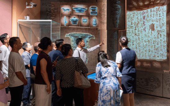 在广州国家版本馆讲解员的引导下,教师们依次参观了“真理之光——马克思主义中国化时代化经典版本展”“斯文在兹——中华古代文明版本展”“岭南文脉——广东历史文化版本展”等核心展区。从甲骨、青铜器、简牍到古籍、拓片、报刊,从《共产党宣言》早期译本到岭南名家手稿,丰富的版本实物与现代化的展陈方式相结合,生动展现了中华版本文化的历史脉络与时代价值。教师们不时驻足凝视,认真聆听讲解,详细了解不同版本背后的历史故事与文化内涵,深切感悟历代先贤对文明传承的坚守与贡献。