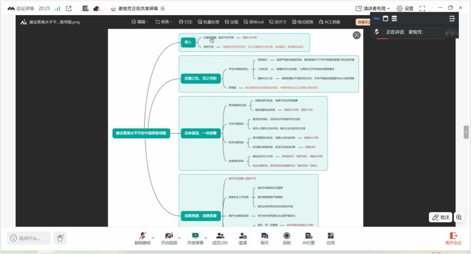 会议伊始,由主备课教师谢俊芳进行说课展示。她围绕专题《聚焦建设更高水平平安中国》,以一张思维导图开篇,系统梳理本讲教学框架:“发展之机,民之所盼”“总体谋划,一体部署”、“成果亮眼,成绩显著”。通过引用“罗永浩与西贝”、“余华英案”、“背着国徽去开庭”、“防城港亮证姐”等最新案例,以及结合官方权威数据,给大家立体呈现出平安中国建设成效,并通过弹幕讨论、即时投票等方式,示范如何“以学生为中心”展开课堂互动设计。
