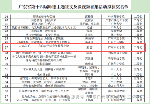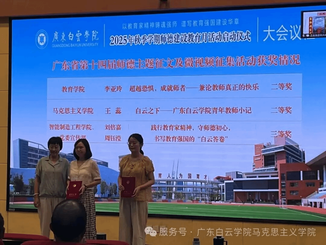 在“广东省第十四届师德主题征文及微视频征集活动”评选结果中,我院王蕊老师的参赛作品《白云之下——广东白云学院青年教师小记》获得二等奖。文章聚焦马克思主义学院余小红、郑中仁、罗燕虹三位老师的工作日常,既记录三位教师从“爱与责任的传递”“精神层面的邀约”“思想方向的引领”等不同维度对学生润物无声的影响,也展现出我校青年教师在深耕教坛的前辈教师们的引领下,怀揣热忱接力育人、以青春活力践行教育初心的蓬勃力量。