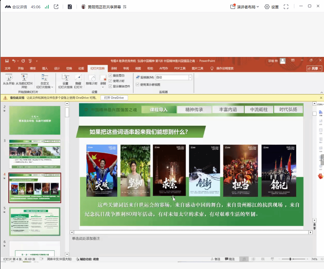 车佳锋老师的教学展示聚焦“课程逻辑梳理”与“校情学情结合”。他首先系统梳理了第三章第一节《中国精神是兴国强国之魂》的内在逻辑,帮助在场教师明晰知识点间的关联的与教学重点;其次,在案例选取上,车老师充分结合广东白云学院的教学实践与学子事迹,以学校“产教结合”的教育模式为例,展现学校在培养学生实践能力与职业素养方面的探索;同时讲述了白云学子蔡俊言等案例故事,让教学内容更具亲和力与感染力。