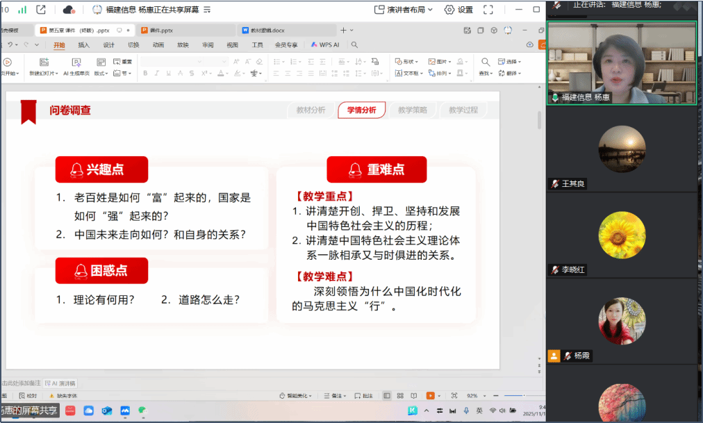 11月13日上午,马克思主义学院《毛泽东思想和中国特色社会主义理论体系概论》课程组通过腾讯会议平台举办了一场主题为“融入全会精神,深化教学设计”的集体备课会。会议特别邀请福建信息职业技术学院马克思主义学院副院长、教育部第三届教学展示概论课一等奖获得者杨惠副教授进行教学示范,由“概论”教研室主任杨霞副教授主持,桑立群副院长及课程组全体教师参加。