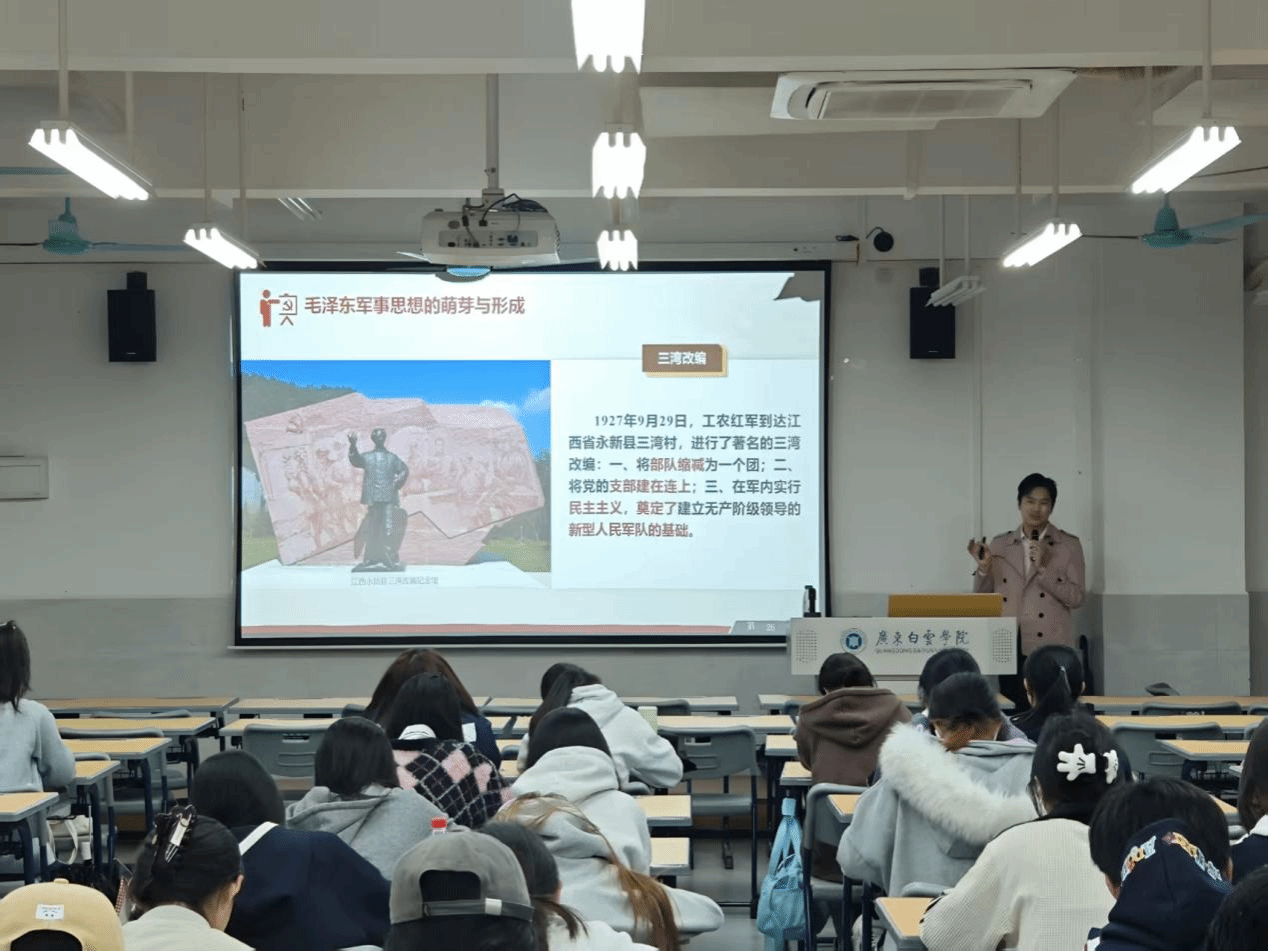 为持续推进军事理论课程教学改革,全面落实立德树人根本任务,11月18日晚,马克思主义学院在明德楼208教室成功举办“青年教师公开课”活动。中国近现代史纲要教研室主任张龙龙教授以“毛泽东军事思想的理论内涵及时代价值”为题,带来一堂内容丰富、形式生动的思政示范课。