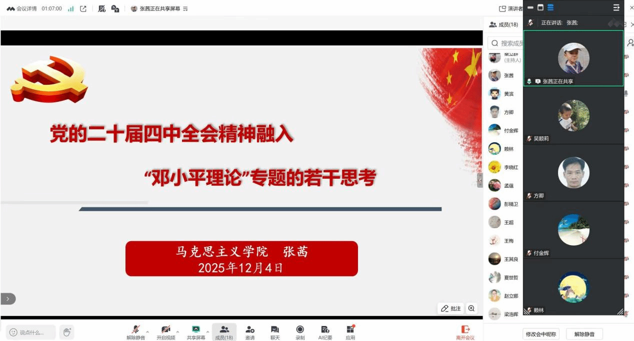 2025年12月4日上午,马克思主义学院《毛泽东思想和中国特色社会主义理论体系概论》课程组举行了第四次集体备课会。李晓红教授和张茜博士作为主讲人展示了自己的教学设计和深入思考。“概论”教研室主任杨霞副教授主持会议,桑立群副院长及课程组全体教师参加。本次备课会聚焦两大核心主题:“经典原著原文有机融入课堂教学”与“党的二十届四中全会精神”融入“概论”课。