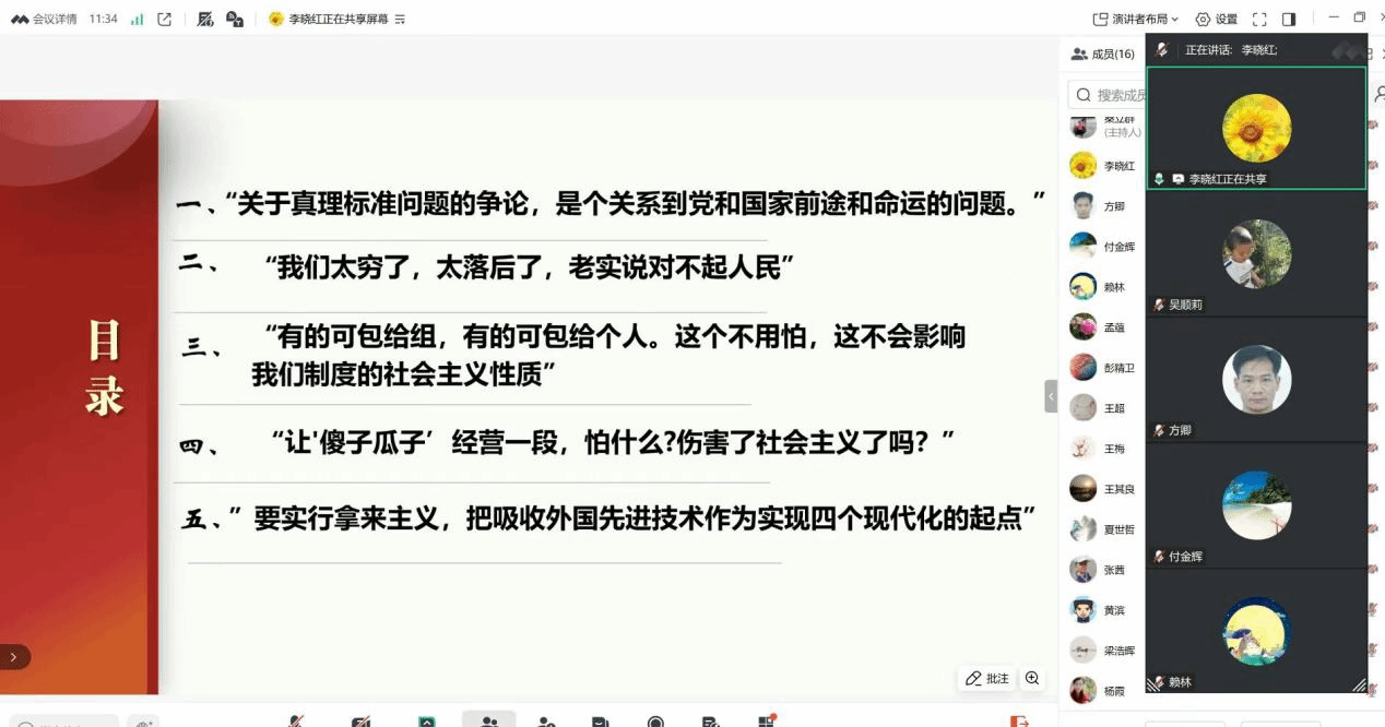 在自由讨论与总结环节,与会教师各抒己见、畅所欲言。黄滨教授高度肯定李晓红教授的教学设计,认为设计“原著融入深、案例结合实、问题意识强”,并补充广东从化联产承包责任制的地方案例,认为教学中可以突出地域特色。付金辉教授指出,两位主讲人都以案例为支撑,逻辑主线清晰,实现了讲深讲透教材理论的教学目标。涂浩然博士谈到他在对本专题教学设计时,注重邓小平理论与毛泽东思想的对比,可以加深对邓小平理论源流的理解。