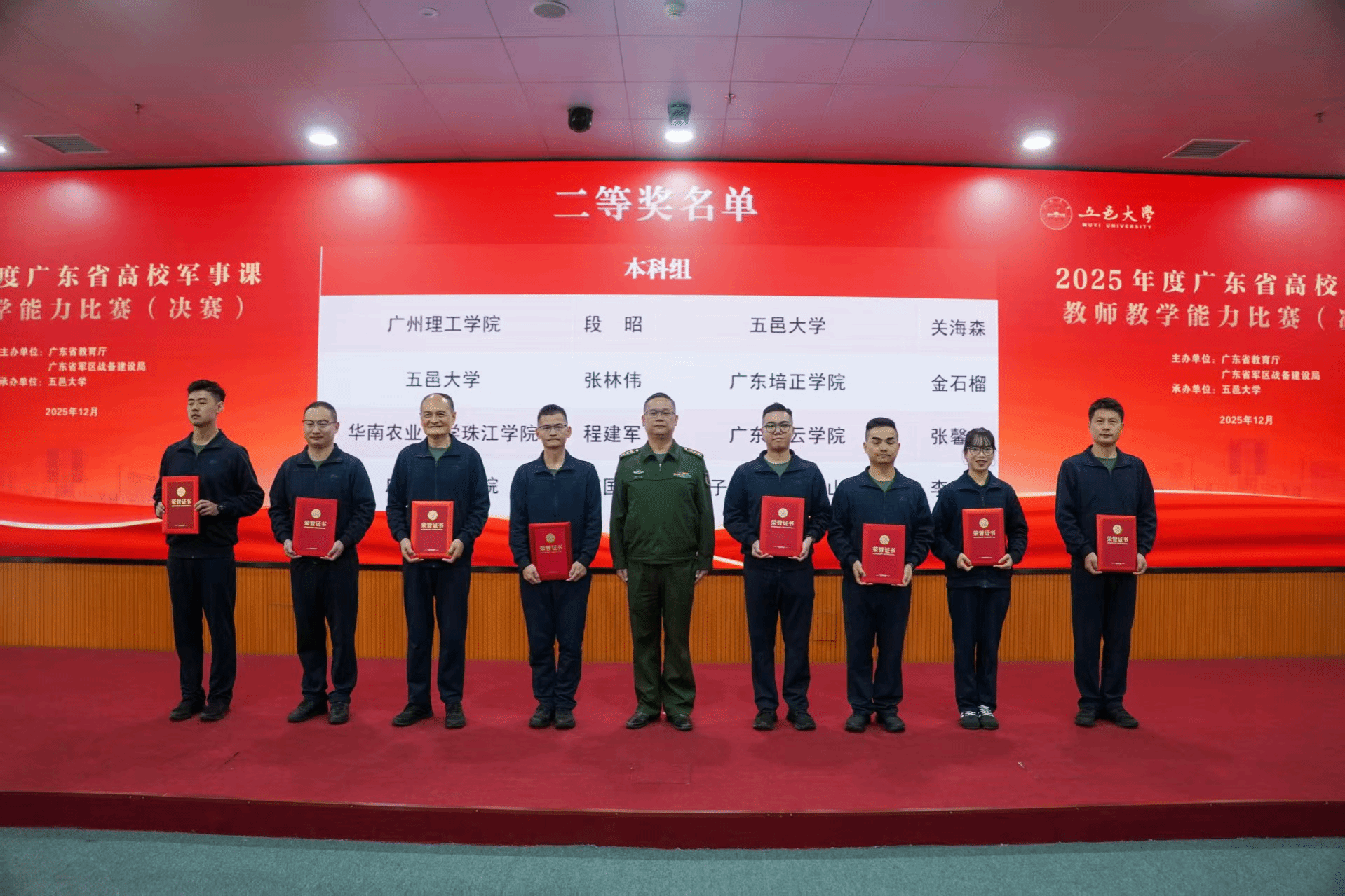 2025年12月3日至5日,由广东省教育厅、省军区战备建设局主办,五邑大学承办的广东省高校军事课教师教学能力比赛在江门落幕。我校马克思主义学院张馨丹老师凭借扎实功底荣获个人二等奖,学校获评“优秀组织奖”,彰显了我校国防教育的扎实成效。